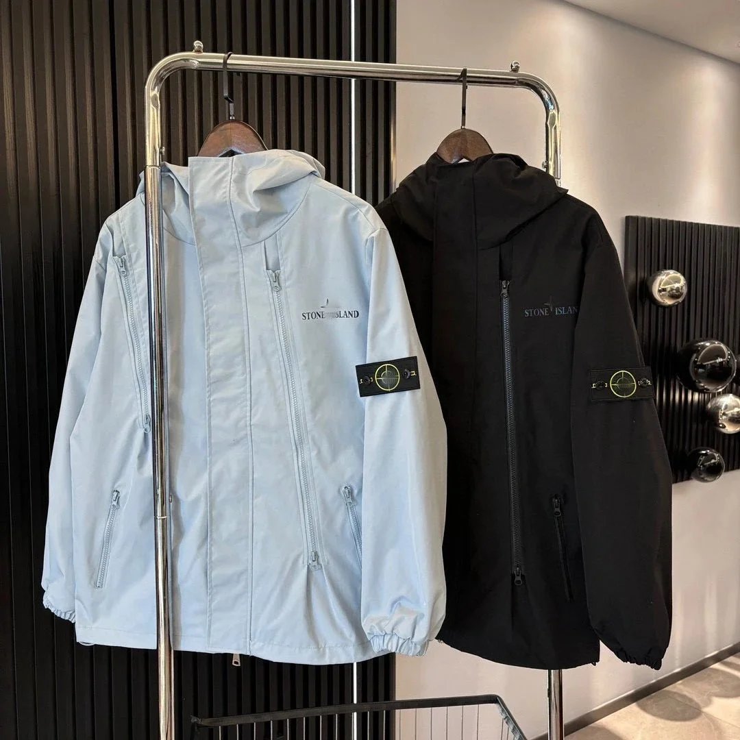 美式经典贴布户外多拉链连帽冲锋衣夹克石头