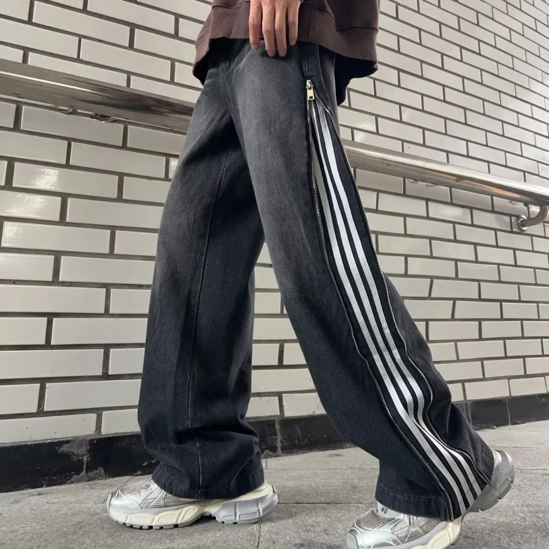 * * * ** * * * * * * * * * * * * ** * * * * * * * * * * * * *三条杠拼接牛仔裤男士痞帅宽松直筒休闲长裤