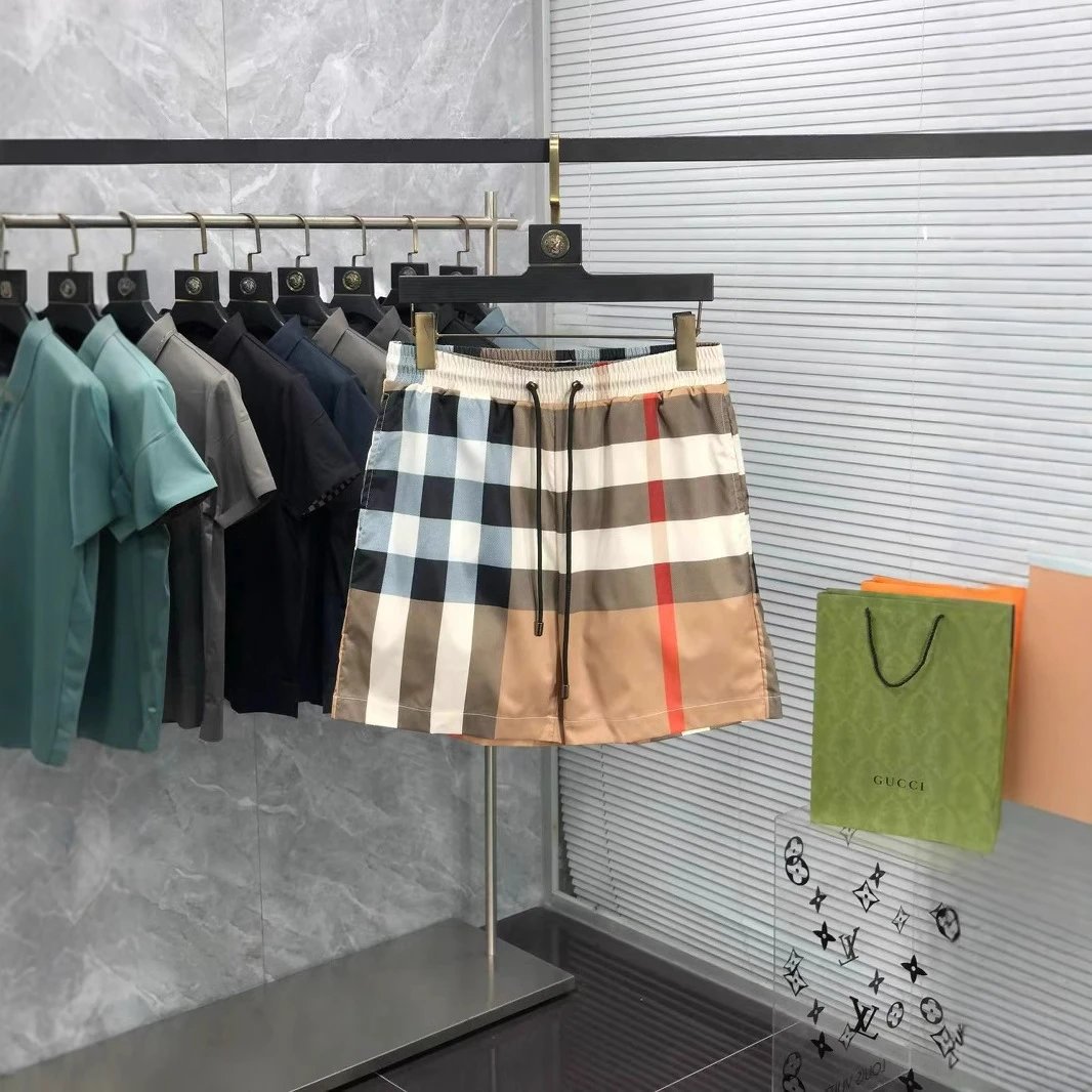 夏季新款男式外贸沙滩裤格子条纹速干弹力短裤休闲情侣海边运动裤