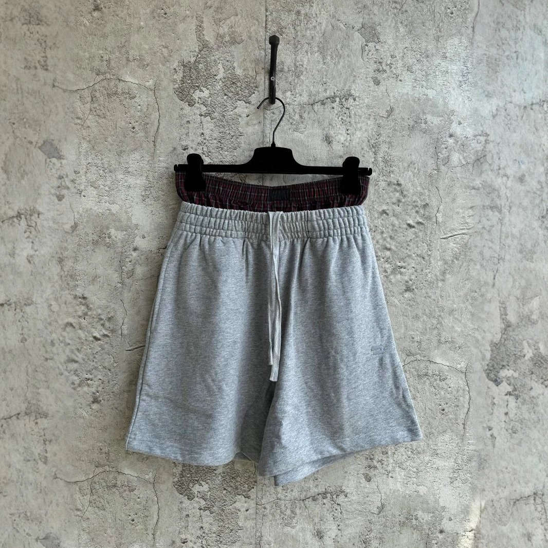 新款假两件格子纽扣拼接短裤宽松版型男女同款