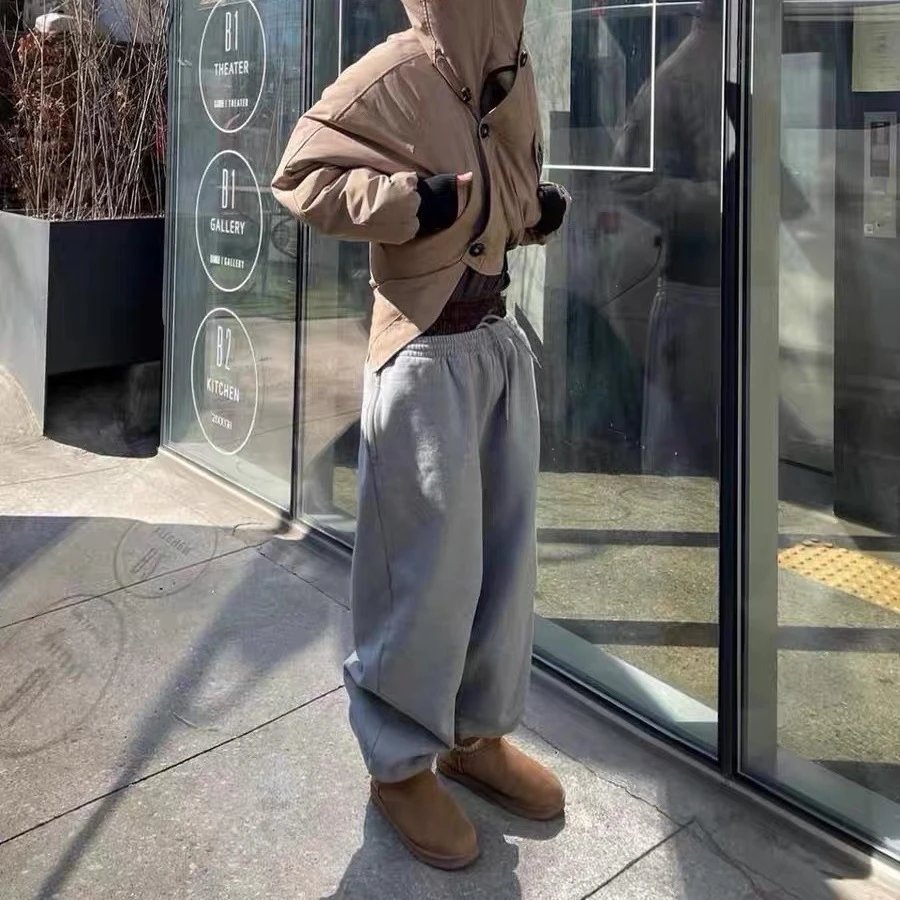新款重磅假两件格子纽扣拼接刺绣长裤卫裤宽松休闲运动潮